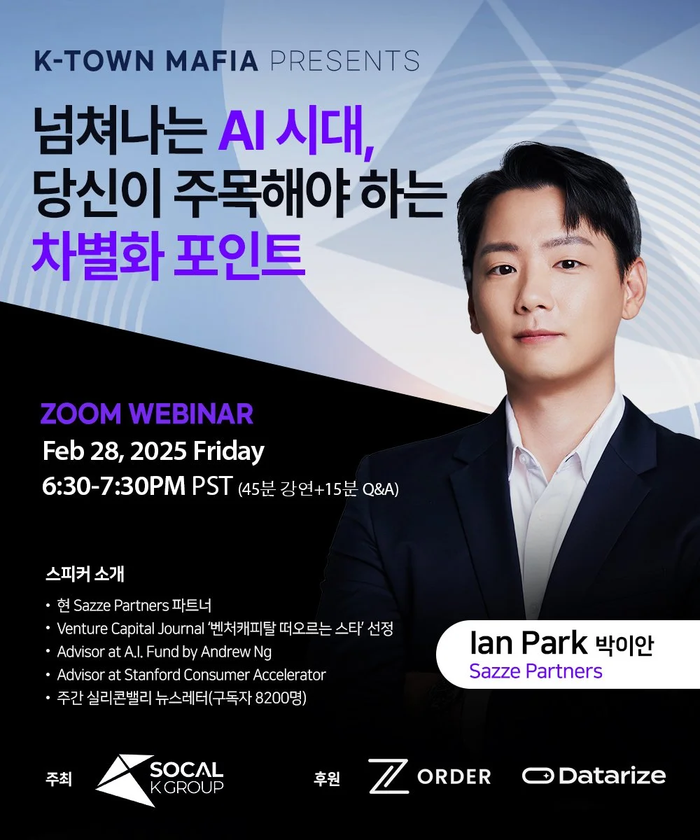 모두가 AI 에 집중할 때, 우리는 어떻게 차별점을 두어야 할까요? 실리콘밸리 스타트업 씬에서 그 존재감을 강력하게 굳히고 있는 VC, Sazze Partners의 파트너이자 8000여명이 구독하는 뉴스레터 <주간 실리콘밸리> 운영자인 Ian Park님이 엘에이로 오셔서 우리에게 AI시대 차별화 인사이트를 나눠주신다고 합니다!